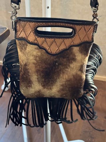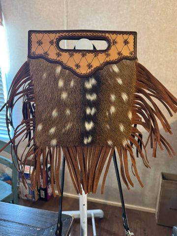 Tooled large lined purse with shoulder strap. Made out of genuine axis hide on the front and brown leather in the back.