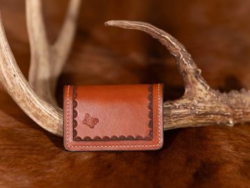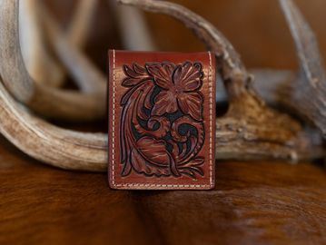 Floral tooled bifold money clip wallet.