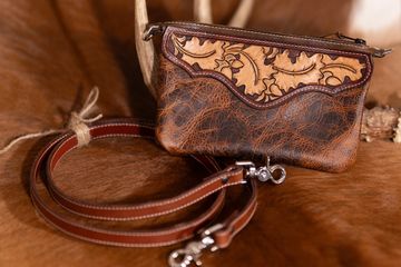 Oak leaf tooled ladies clutch purse with a lined shoulder strap.
