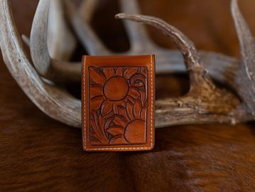 Sunflower tooled bifold money clip wallet.